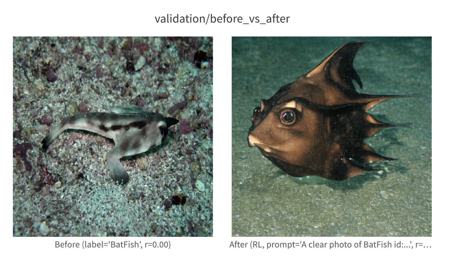 Overall, the RL pipeline successfully optimized its own reward function but did not produce diffusion edits that improved classification performance on COD10K, indicating a misalignment between the reward and the downstream objective.