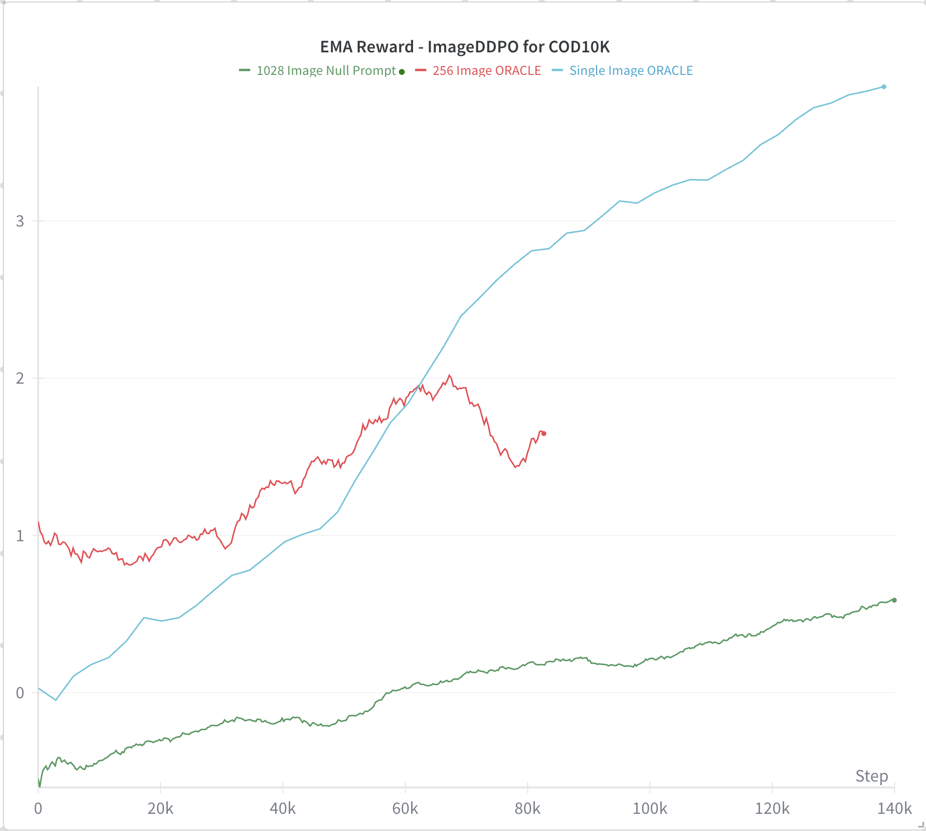 We conducted extensive hyperparameter sweeps and over one hundred training runs across different dataset sizes, prompt regimes, and noise strengths. Despite these efforts, RL did not yield accuracy improvements on the camouflage task. This holds even for long training horizons, where reward continues climbing but the edited images do not meaningfully aid CLIP in identifying the camouflaged animal.