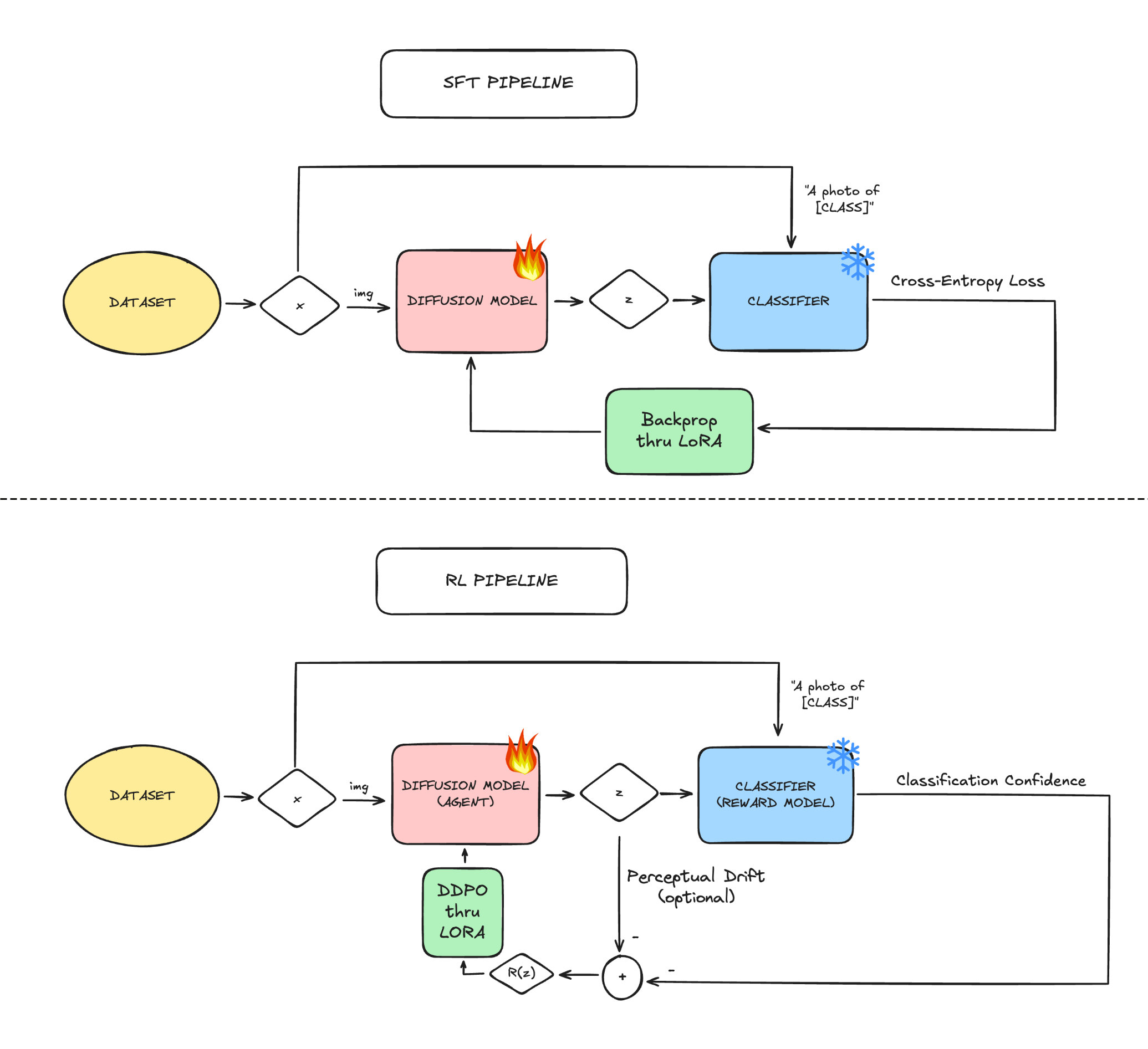 Our SFT method trains a LoRA adapter on the UNet component of Stable Diffusion by directly minimizing CLIP classification loss. Unlike RL, SFT maintains the full computational graph through the diffusion pipeline and backpropagates through the VAE decoder and frozen CLIP classifier to obtain exact gradients with respect to the classification objective. To keep the sampling path differentiable, we use deterministic DDIM sampling (\( \eta = 0 \)).